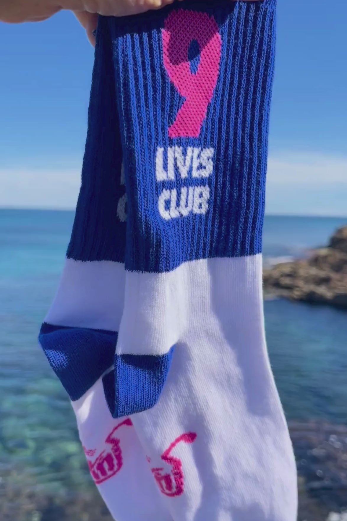 Join the 9 Lives Club. These Fizzkini crew socks are made for anyone who walks through life with curiosity, courage, and a little bit of cat energy. Featuring bold blue ribbing, a clean white base, and a playful pink “9 Lives Club” graphic, this pair is equal parts sporty and quirky.